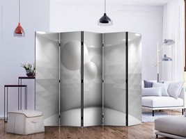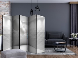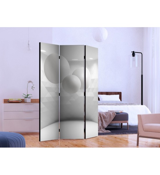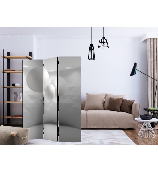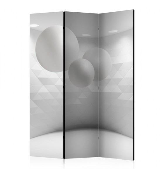 Découvrez ce paravent en toile à la fois original et moderne, une pièce blanche et épurée dans laquelle flottent trois sphères de tailles différentes comme en apesanteur, où les murs très graphiques sont éclairés par des spots du haut vers le bas. C'est une séparation décorative qui apportera une touche design et futuriste dans votre pièce ! C'est un paravent décoratif qui pourra s'installer dans des intérieurs de professionnels ou particuliers comme : bureau, boutique de décoration, salon, chambre, restaurant à thème, véranda, hall d'entrée, bureau d'architecte, classe de physique et chimie... |