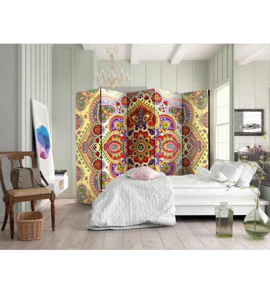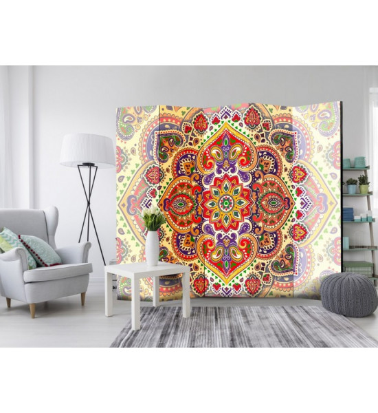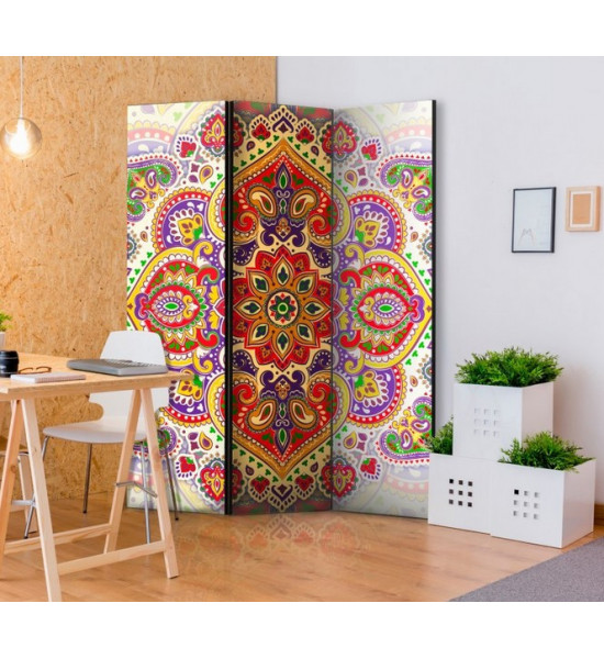 Le paravent Mandala s'intègrera dans les: restaurant exotique, boutique cartomancienne, centre bouddhiste, centre de relaxation, salon, chambre, couloir ... Ce paravent est confectionné à la commande, au décor et au nombre de panneaux demandés.