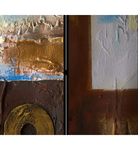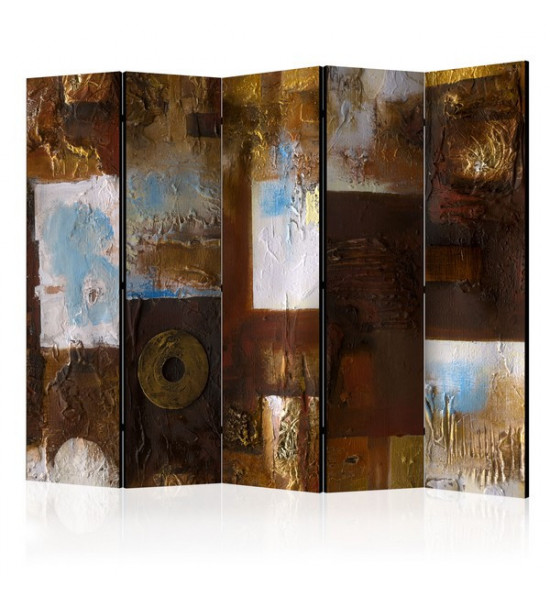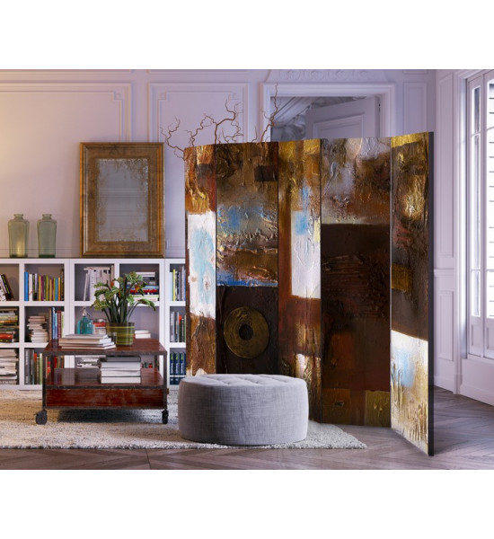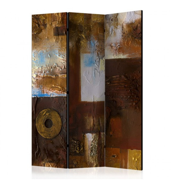 Un paravent dans les teintes ocre, brun, marron, beige, or et bleu; des teintes chaudes et terreuses, à l'instar d'un tableau ou l'on découvre de l'épaisseur (visuelle) de gouache