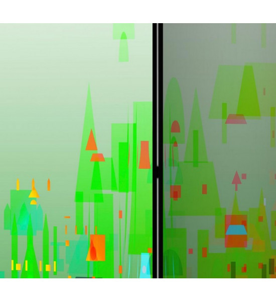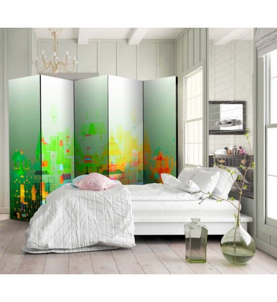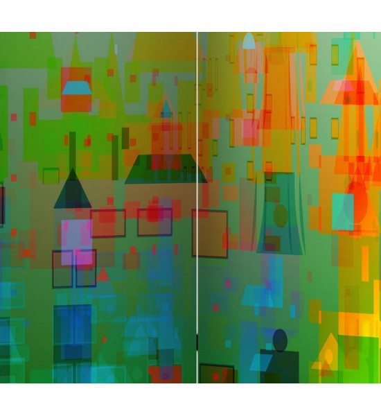 paravent CITY POP, comme son nom l'indique ce paravent imprimé présente un décor particulièrement coloré et stylisé qui convient aux bureau, chambre, salon, appartement de ville, déco de vitrine d'agence de voyage etc... Ce paravent est en 3 ou 5 panneaux et il est fabriqué à la commande |