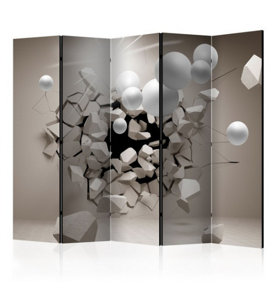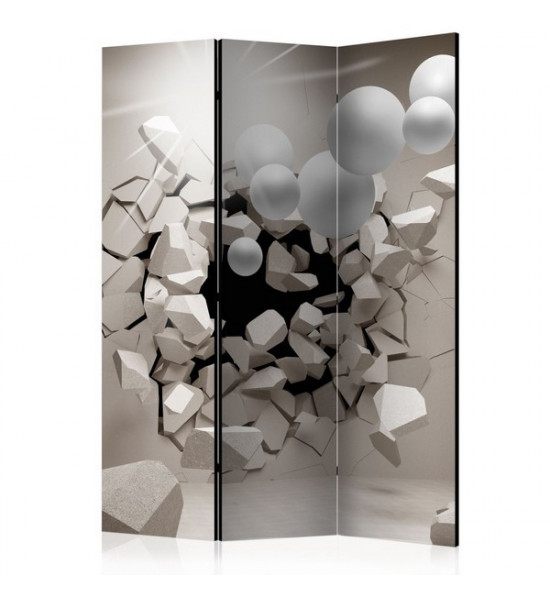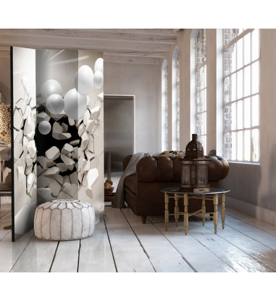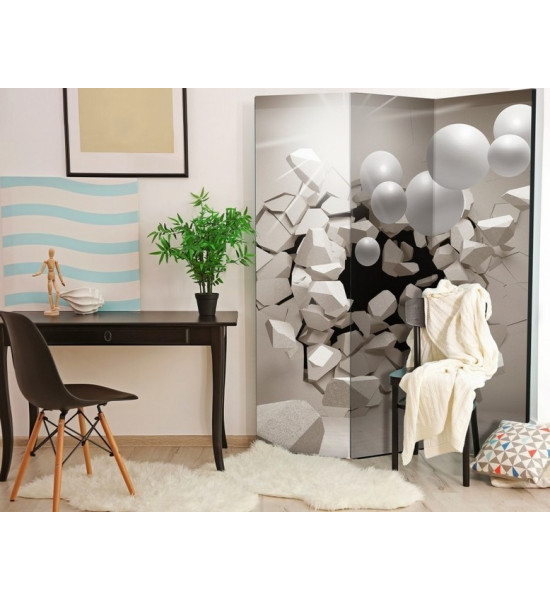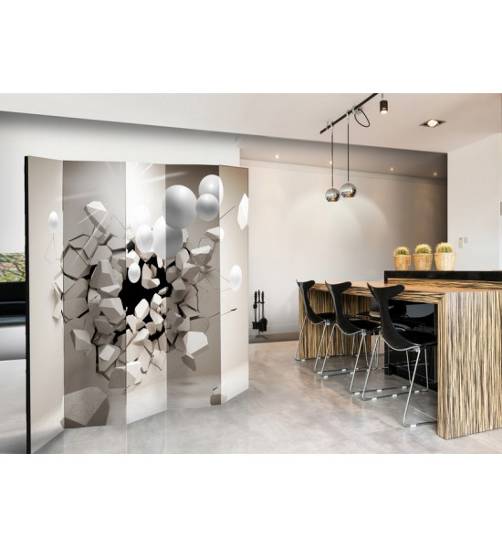 Paravent moderne avec effet en trompe l’œil de boules traversant une cloison, les couleurs sont douces et s'intègreront dans des espaces blancs ou noirs Apportez une touche déco contemporaine, donnez du mouvement et du dynamisme à votre intérieur avec ce paravent design |