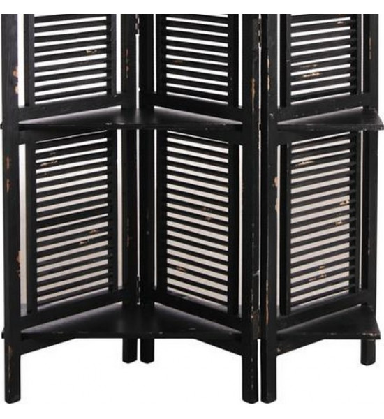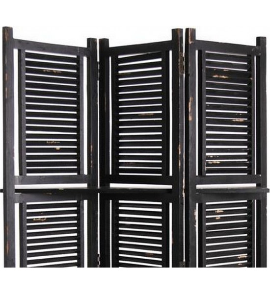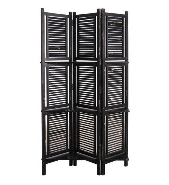 L'ensemble est de teinte noir partiellement et volontairement écaillé pour lui apporter visuellement son vieillissement, vous aurez ce sentiment d'avoir un meuble qui a vécu et conservé son authenticité Les panneaux sont ajourés et lattés horizontalement, cela permet à l'air et la lumière de passer tout en faisant office de séparateur |