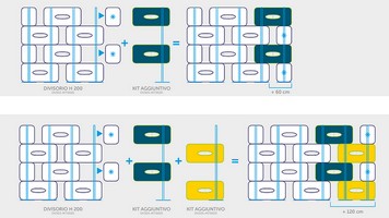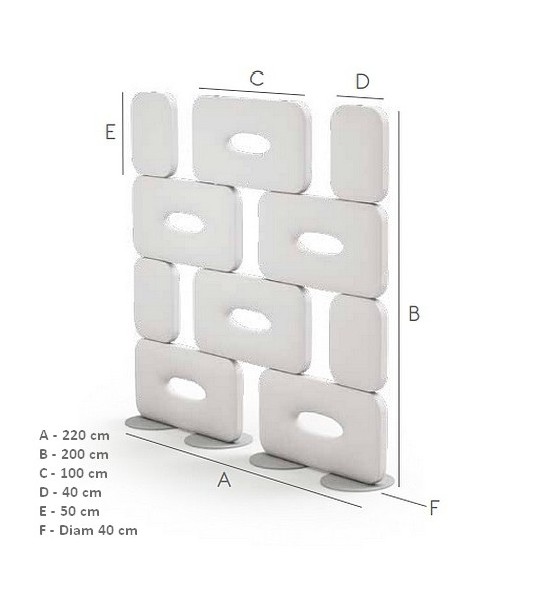 PARAVENT H 200 x L 220 cm: Il est composée de 10 modules : 6 modules de L 100 x H 50x épaisseur 8 cm + 4 modules de L 40 x H 50 x épaisseur 8 cm KIT Supplémentaire H 200 x L 100 cm : - 2 modules de L 100 x H 50 x épaisseur 8 cm + 1 socle avec tige verticale - les modules sont percés pour laisser passer la tige verticale de soutien - Coloris: Blanc, taupe, jaune, rouge, bleu clair, bleu, anthracite - Notice de montage, cliquer ICI |