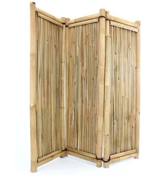 | Paravent d'intérieur ou d'extérieur en canes de bambou vierge résistant aux intempéries de teinte variable de naturel à jaune/vert. Les paravents en bambou peuvent être différents les uns des autres ce qui accentue leur caractère et leur relief visuel, ceci est dû au fait qu'ils sont issus de plantes naturelles, vivantes et donc de formes variées Le châssis fait 5 à 6 cm de diamètre et les 18 à 24 canes de bambou environ 2 à 3 cm de diamètre. Les montants verticaux sont enchâssés en parties haute et basse dans un 1/2 jonc gros diamètre en bambou et sont traversés en trois hauteur différentes par des renforts horizontaux |