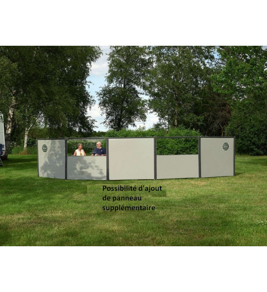 | Ce paravent de camping ou de plage intègre une partie transparente de type "cristal" au centre, cela permet de vous protéger du vent tout en conservant une visibilité ou une surveillance sur l'extérieur Ce paravent brise-vent est en polyester enduit coloris gris clair Possibilité d'ajout de panneaux supplémentaires de 140 cm x L 154 cm (en option), permettant de couvrir une longueur importante: pour les mobile-home, camping-car, protection jacuzzi, piscine etc... Il est livré avec les barres inox (barres horizontales supérieures comprises), haubans, sardines |