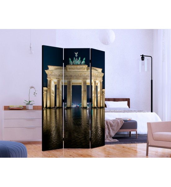 Découvrez un des symboles de la ville de Berlin, la "porte de Brandebourg" de nuit, elle fut pendant presque trois décennies le symbole de la division de la ville car le monument faisait partie intégrante du mur de Berlin. Elle fut construite de 1788 à 1791 dans le style néoclassique, en s'inspirant du Propylée de l'Acropole d'Athènes. Sur ce paravent en toile on peut voir les pavés au sol encore humide qui reflètent les lumières du monument, de grandes colonnes et le quadrige en cuivre qui surplombe la Porte de Brandebourg ! Ce paravent en toile apportera un bout d'histoire dans votre pièce. C'est un paravent décoratif qui pourra s'installer dans des intérieurs de professionnels ou particuliers comme : bureau, boutique de décoration, salon, chambre, restaurant à thème, pub, véranda, loft, agence de voyage, hôtel... |