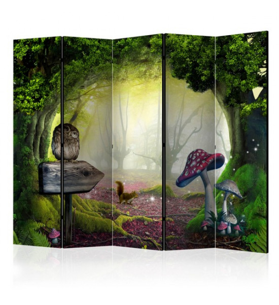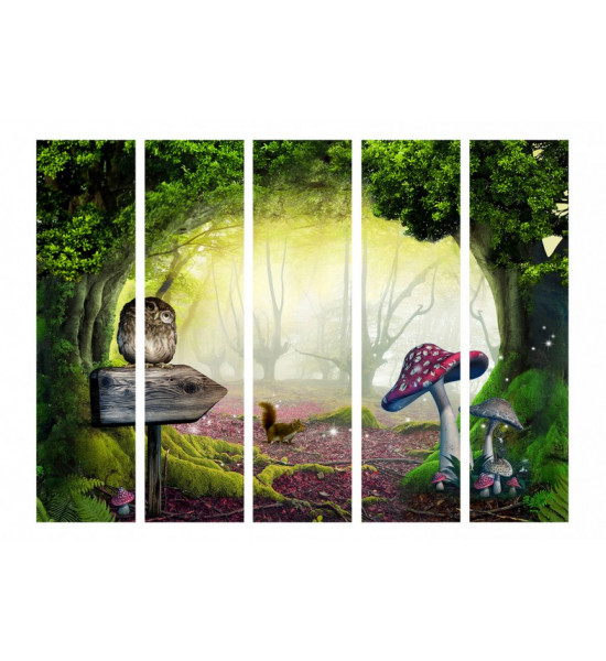Voici une forêt enchanté, où l'on voit une chouette au regard perçant sur un panneau de direction en bois, d'immenses champignons colorés, les racines des arbres qui sortent de terre, un petit écureuil tout mignon est attentif et des lucioles qui scintillent !