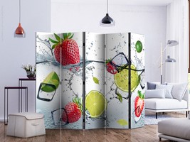 Voici un paravent en toile plein de fraicheur qui saura vous séduire par ses couleurs acidulées et son côté peps ! Des citrons verts et des fraises, entiers ou découpés, sont mélangés à de l'eau et des glaçons, un bel effet de mouvement est donné par les éclaboussures d'eau. Cette séparation décorative apportera une atmosphère 'fresh' et 'fruitée' dans votre pièce ! C'est un paravent en toile qui pourra s'installer dans des intérieurs de professionnels ou particuliers comme : salon, bureau, cuisine boutique de décoration, restaurant à thème, bar à cocktail, bar à jus et smoothie, commerce de fruits et légumes... |