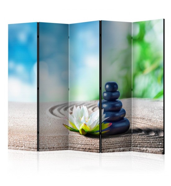 Voici un paravent en toile zen qui offrira de bonnes ondes dans votre intérieur ! Une fleur de lotus aux dégradés de couleurs magnifiques se tient proche de galets noirs de tailles différentes empilés les uns sur les autres, sur le sable fin une trainée ondulée apporte un certain mouvement. Cette séparation décorative offrira une atmosphère calme et sereine dans votre pièce ! vent décoratif qui pourra s'installer dans des intérieurs de professionnels ou particuliers comme : bureau, chambre, salon, boutique de décoration, restaurant à thème, salon de massage, center esthétique, salle de yoga... |