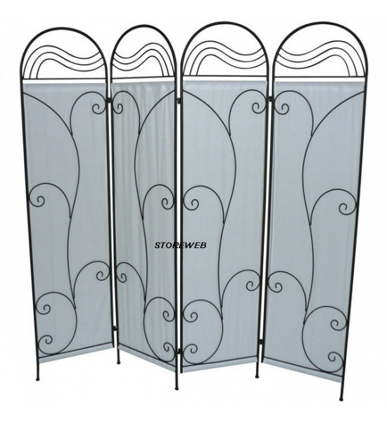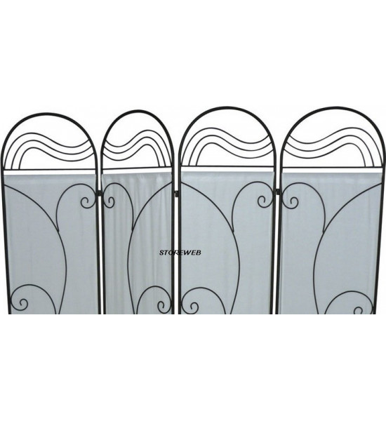 Paravent de 4 panneaux avec structure et volutes de métal, toile 100% coton de teinte gris clair.